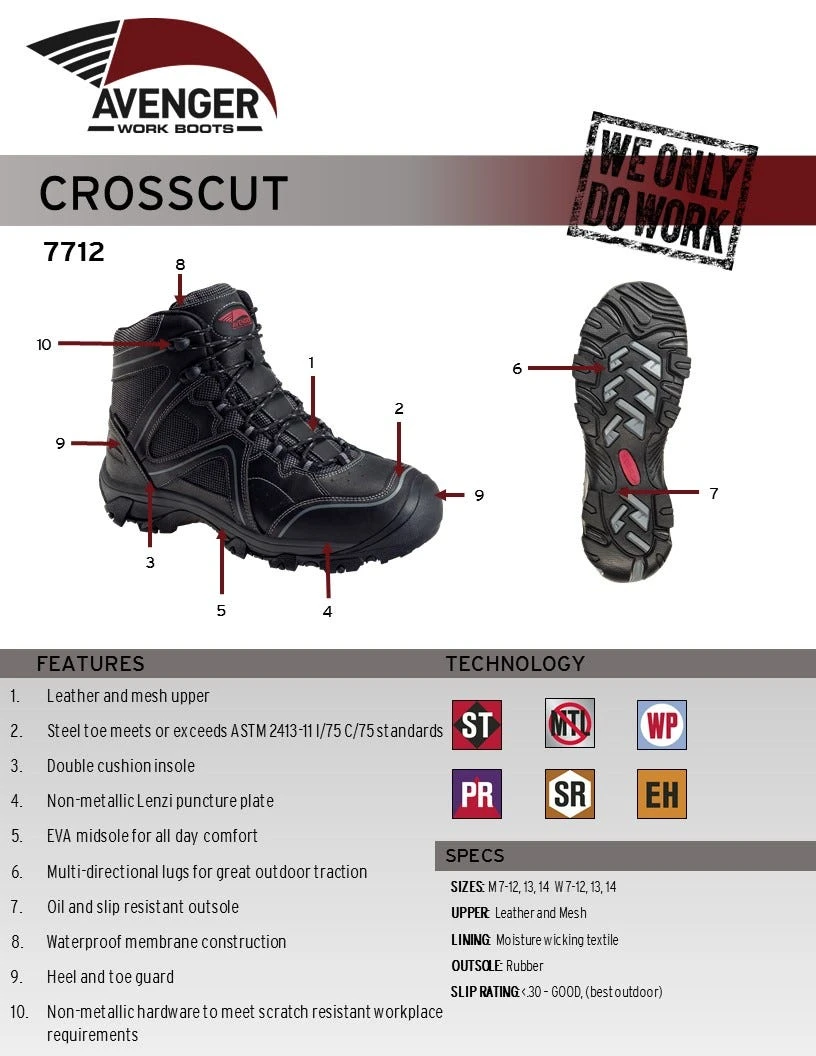 The ~Avenger Men’s A7712 Crosscut 6 Inch Steel Toe Waterproof Boots are determined to keep you safe and comfortable – their special features have been carefully selected to make sure you have high-quality care and coverage. The Crosscut is prepped with waterproofing, safety toe protection, and more.