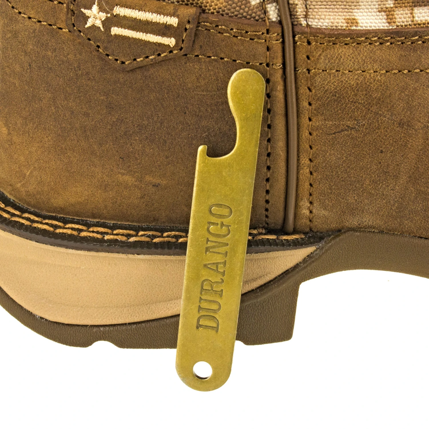 There’s no doubt that you’ll feel comfortable when you put on these men’s pull-on boots, but you’ll also notice their quality craftsmanship. The Durango Western boots for men are designed with a full-grain leather vamp, fox, collar, and pull straps with a 900-denier nylon desert camo shaft. The upper features double row sole stitching for increased durability. Beneath the well-built shaft is a slip- and oil-resistant dual-density and abrasion-resistant rubber outsole. It’s super tough and perfect for handling rough jobs. The rugged outsole also features a 1.5-inch Rocker heel, and the upper features a square toe. Both are essential to the Western-inspired style of the design. Lastly, the Rebel desert camo boots are made with a removable metal bottle opener in the pull-tab. It’s a neat, convenient addition to the already high-quality build.