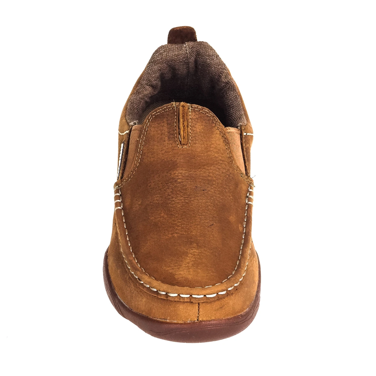 Let’s begin by explaining just how good you’ll look wearing these Cedar Falls moc toe shoes. The upper is crafted from fine full-grain brown leather. The Georgia Boot company chose full-grain leather because of how easy it is on the eyes, as well as its durability. The brown leather is complemented by the lighter-colored stitching on the front of the men’s leather shoes. The stitching moves upward from the front, which is why these moc toe moisture-wicking shoes are called “moc toe.” These have the appearance of a moccasin. As a final touch, these slip-on shoes are crafted without laces, and therefore appear more formal than most other casual footwear.