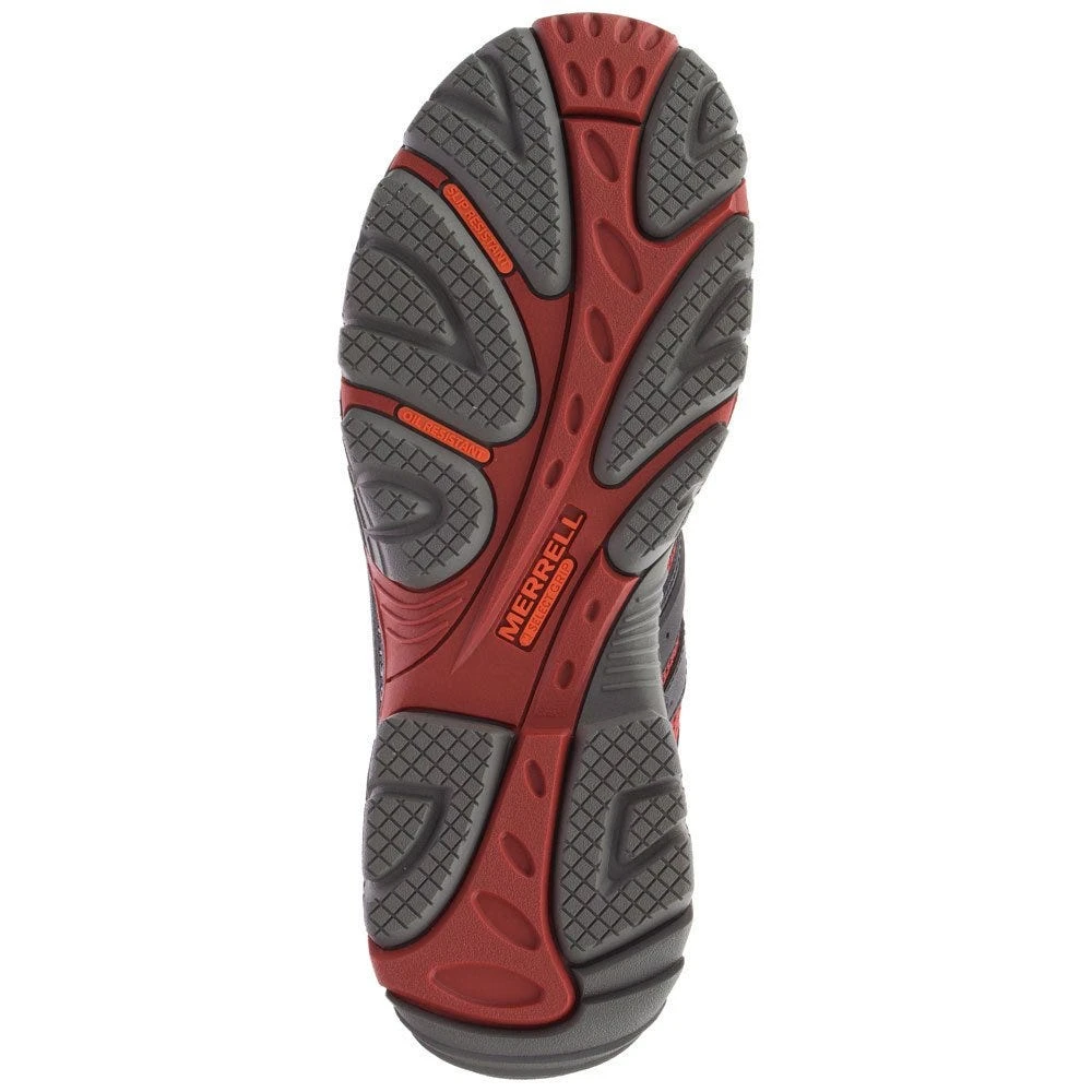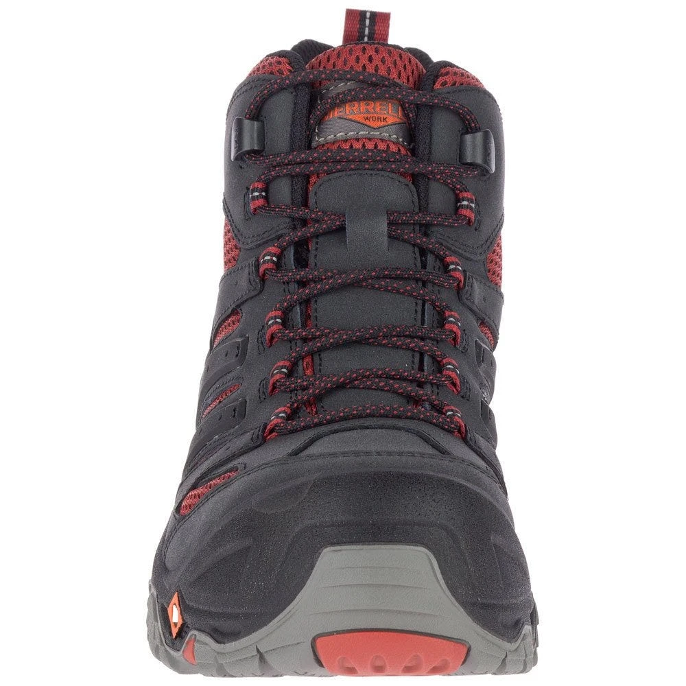 Waterproof synthetic-coated leather and mesh uppers are beyond ready to take on wet weather conditions, and the Merrell M Selectâ„¢ DRY impermeable membranes seal out water and let moisture escape as well. This unique Strobel construction is dependable as it maintains a dry, comfortable environment for your feet. For midfoot support and flexibility, the waterproof Merrell boots have molded nylon arch shanks. Heat-resistant outsoles are included in these black and red safety toe boots, and they provide foot protection for brief periods of direct contact that meet or exceed 500 degrees Fahrenheit (of 260 degrees Celsius).