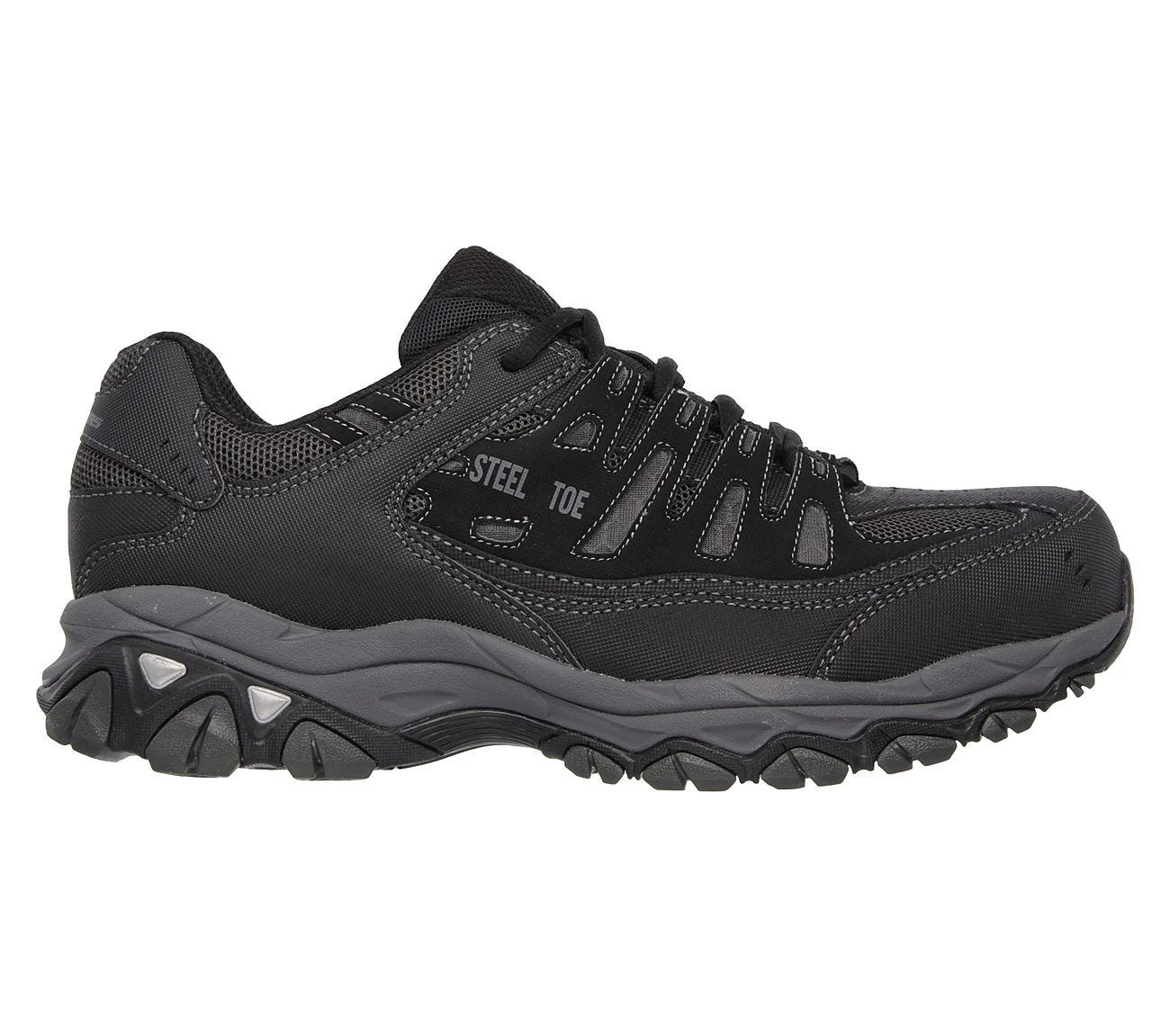 Durable high-abrasion textured leather panels on the uppers work hard to fend off dirt and debris throughout your workday, and Action Nubuck overlays with synthetic protective details increase the abrasion resistance. Skechers truly thought of everything when the brand created this pair of men’s athletic shoes. From stitching accents to the Skechers logo detail to the lace-up sporty casual comfort sneaker design, you’ll be thrilled to own these steel toe work shoes. The lace-up front makes them easy to get on and off, while the lug patterned high traction rubber outsoles paired with 1-1/2″ heels provide you with dependable stabilization.